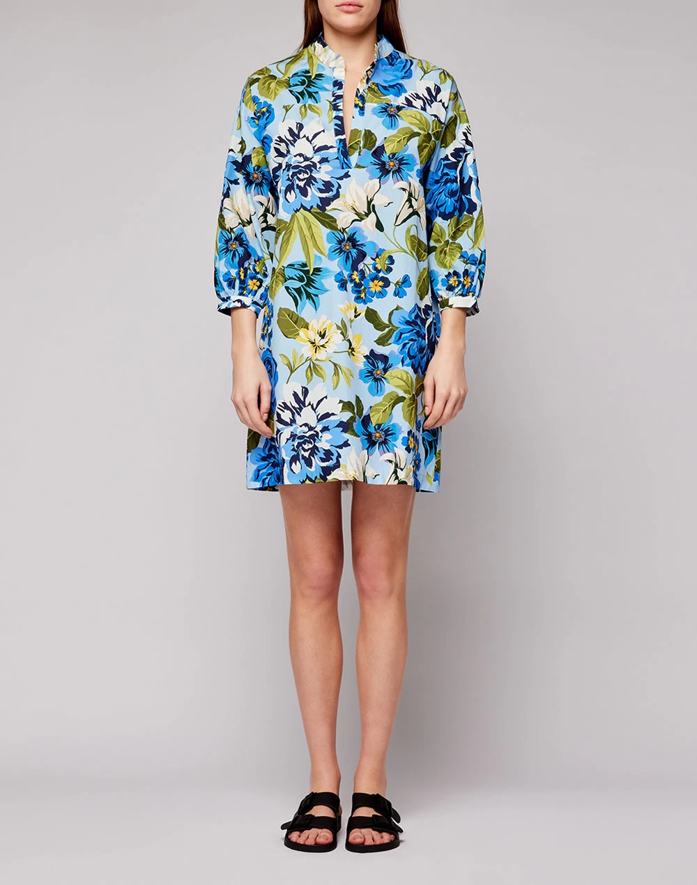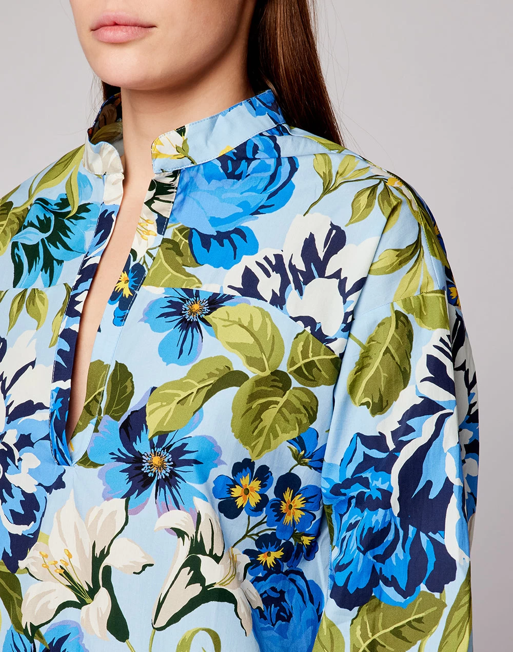 Sfoggia un look dal tocco esotico con questo abito in cotone con collo alla coreana e fantasia floreale. La sua vestibilità ampia consente libertà di movimento e dona comfort e leggerezza.