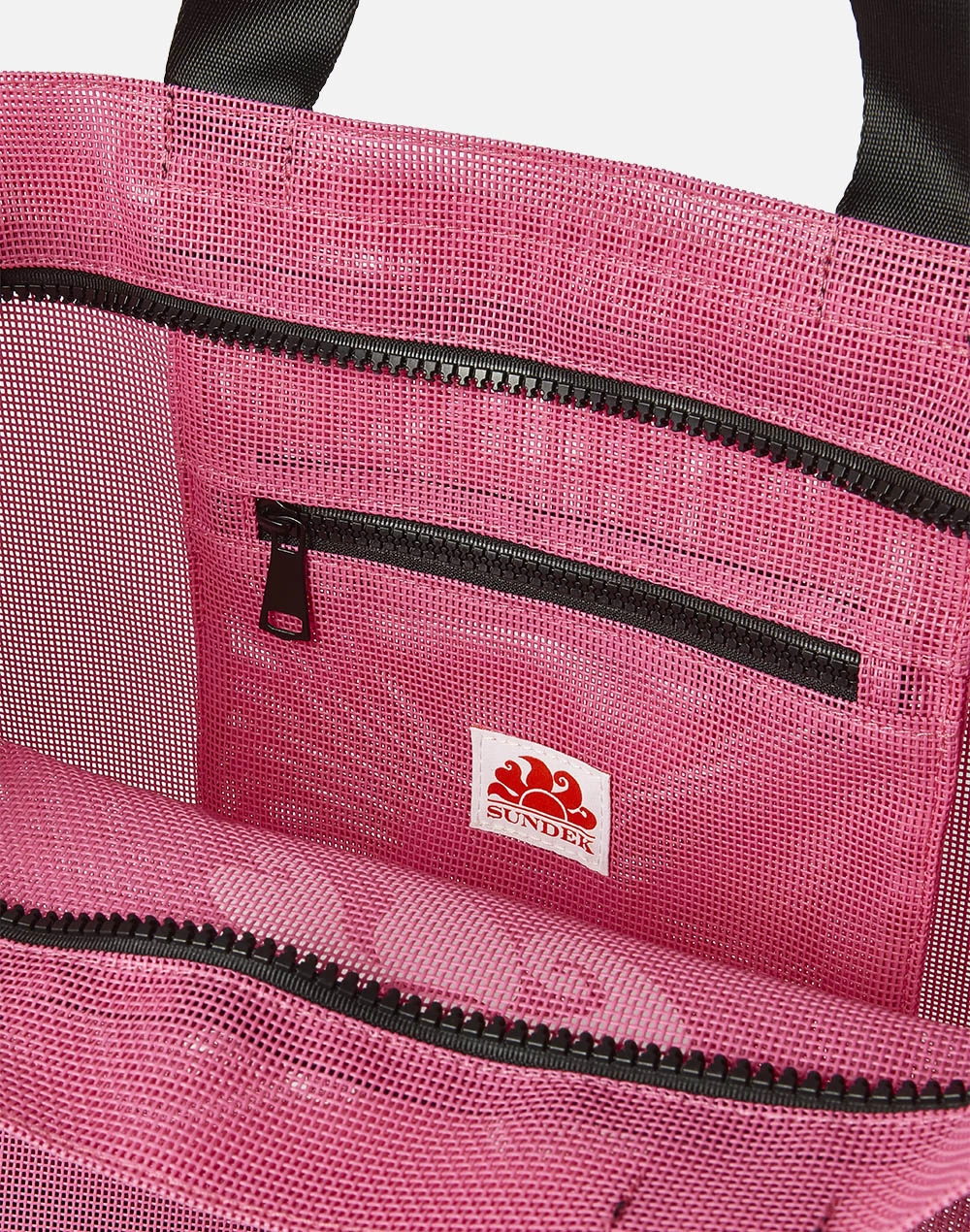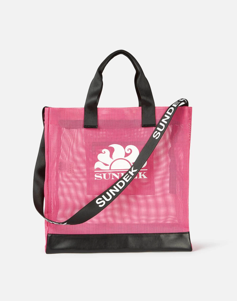 Capiente, leggera e pratica, è la borsa da spiaggia Sundek in mesh con tracolla brandizzata e tasca interna. Si chiude con la zip, ma è dotata anche di manici. Perfetta per portare con te tutto l’essenziale per una giornata al mare o in piscina.