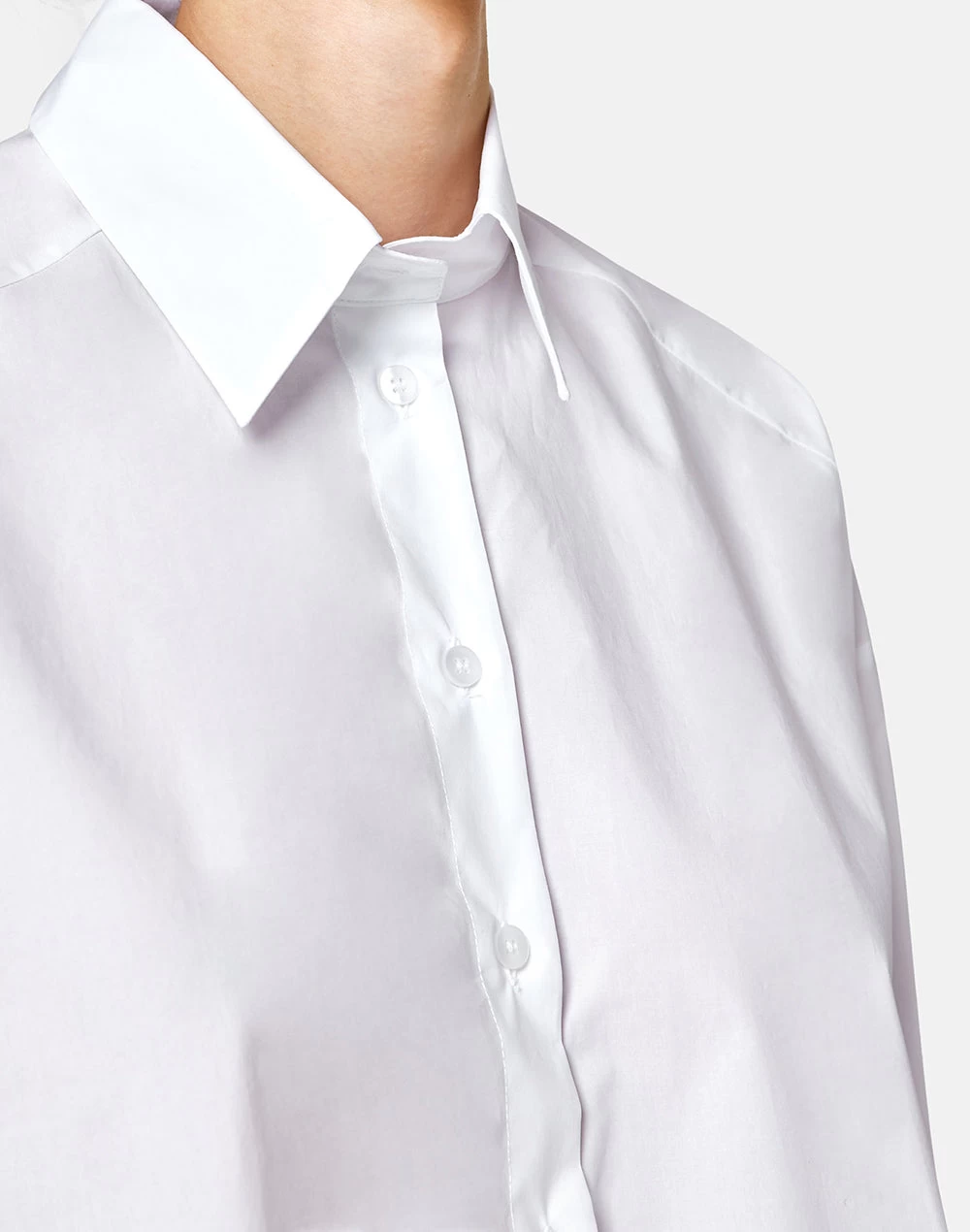 Camicia over in popeline di cotone dal fascino versatile. Fondo asimmetrico e spalle scese per un design essenziale e ricercato.