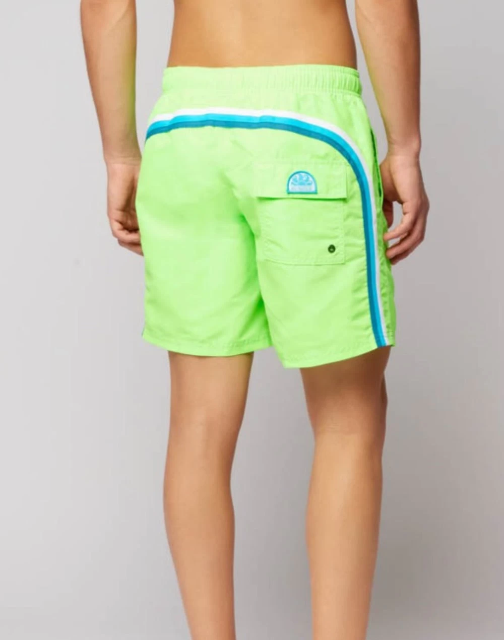 Tutto lo stile senza tempo Sundek in questo boardshort di lunghezza media e con vita elasticata. Elegante, confortevole, destinato a durare vacanza dopo vacanza: è il nostro boardshort classico con coulisse in vita e arcobaleno a contrasto sul retro, realizzato nel nostro storico tessuto nylon taffetà leggero e che si asciuga rapidamente, resistente, con cuciture a tre aghi per un rinforzo ulteriore. Lunghezza 41 cm (taglia M), misurati sul lato esterno della gamba.
