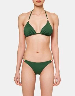 Fai spazio in valigia a questo completo bikini realizzato in tessuto ecosostenibile. Il triangolo è a vela, imbottito, con perline nel laccetti, che puoi anche rimuovere. Lo slip è fisso con dettaglio laterale a tre bande tricolore in stile Sundek.