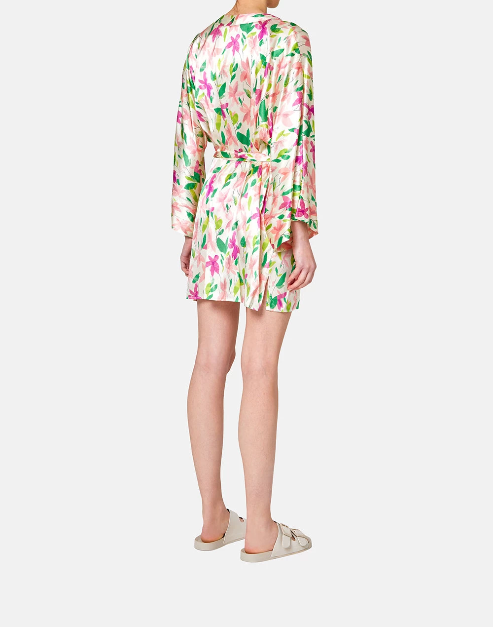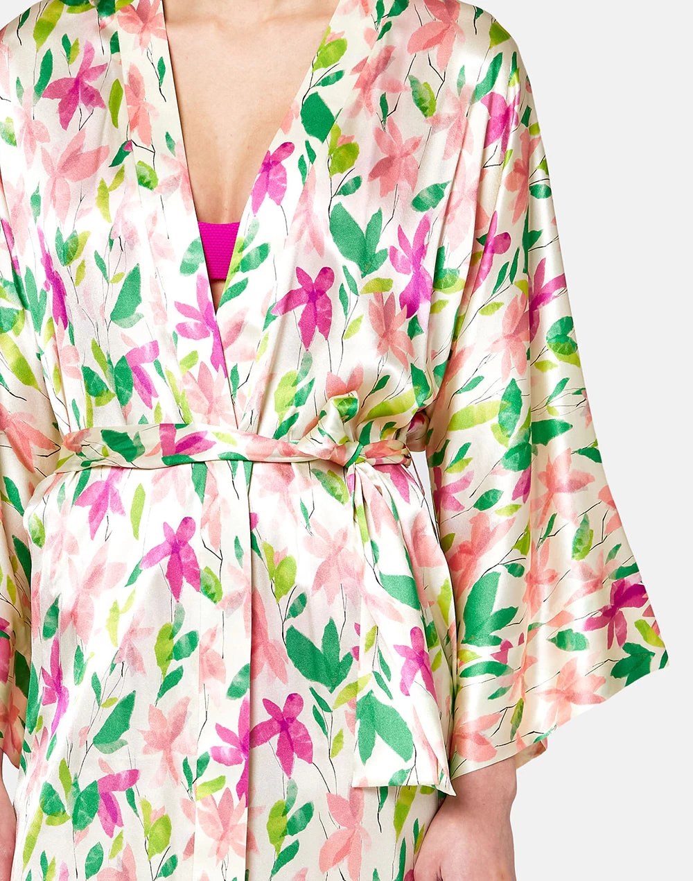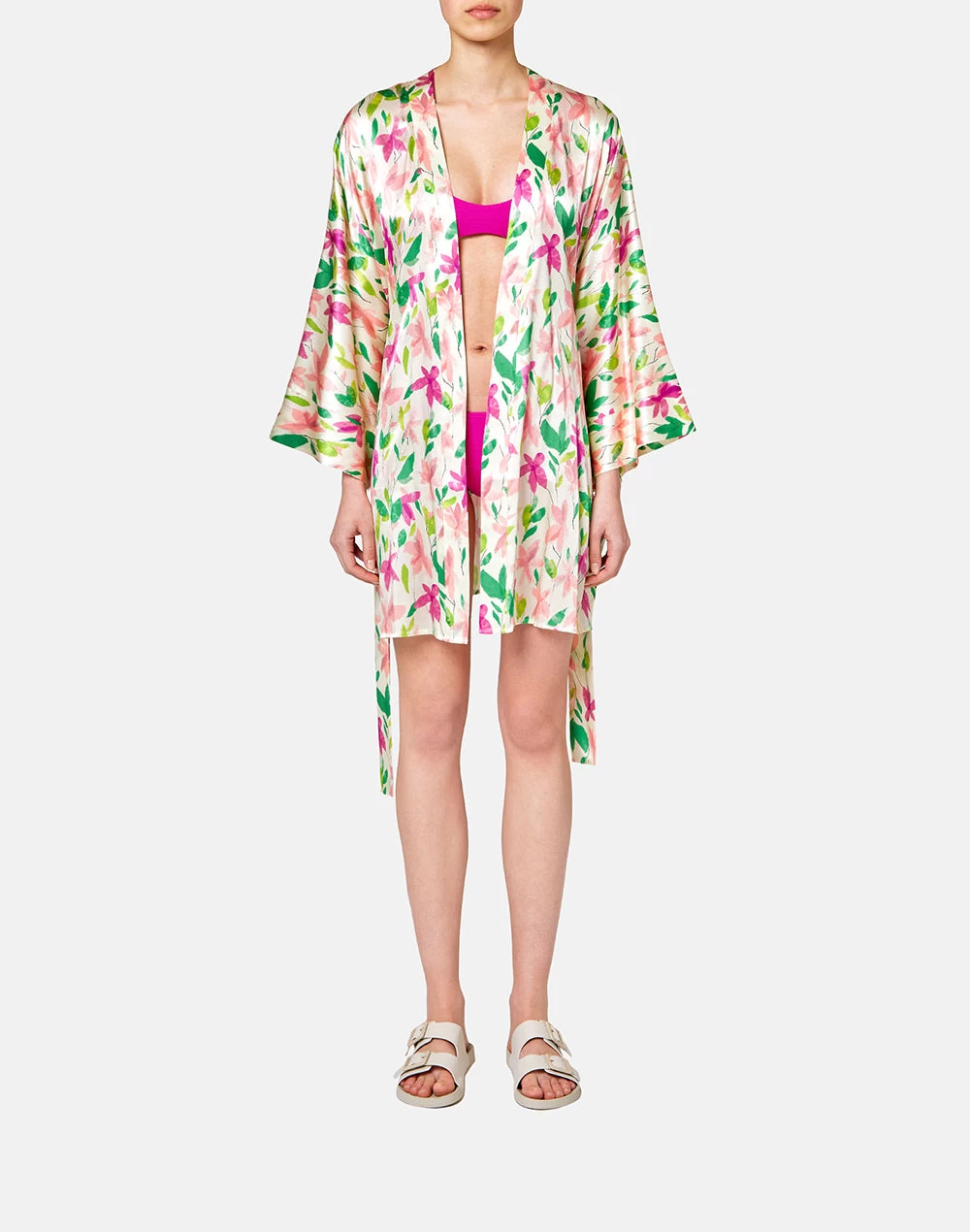 Un capo essenziale e raffinato: questo kimono corto con maniche a tre quarti con elegante stampa Sense Flower può essere indossato con o senza cintura in coordinato indossarlo come preferisci, aperto o chiuso, e creare look diversi con un solo gesto. Abbinabile agli shorts per creare un outfit coordinato.