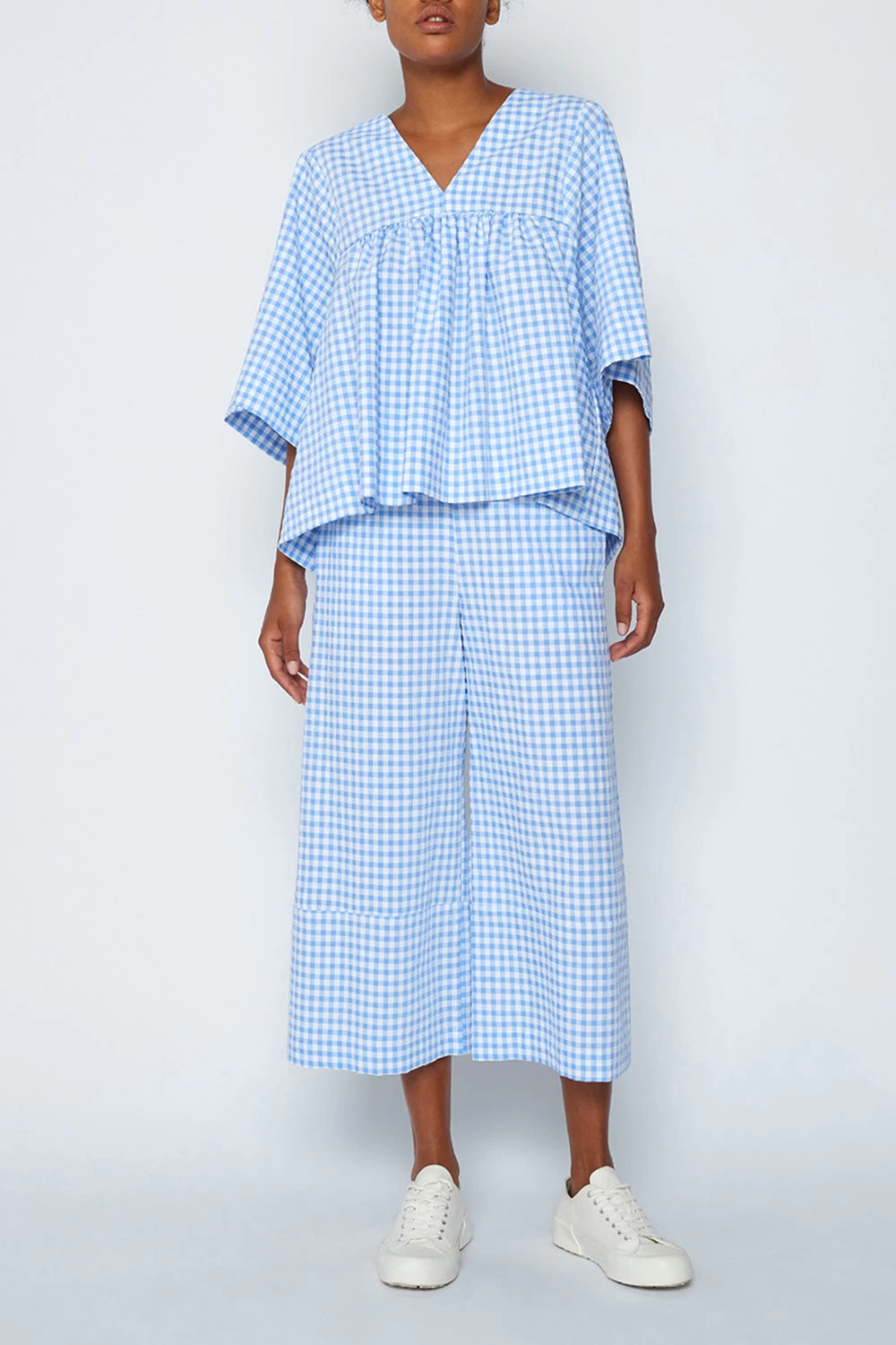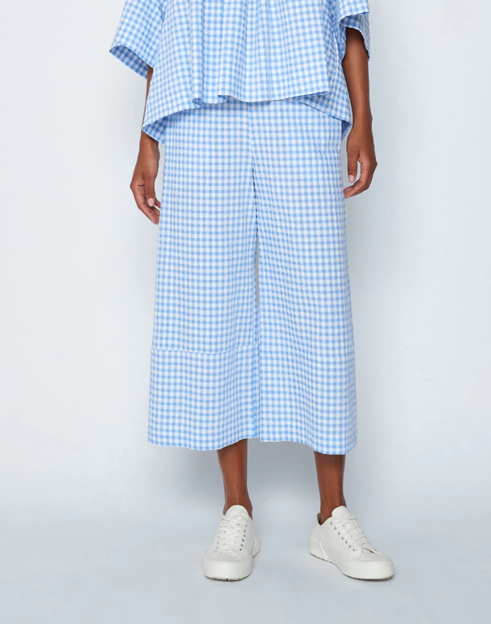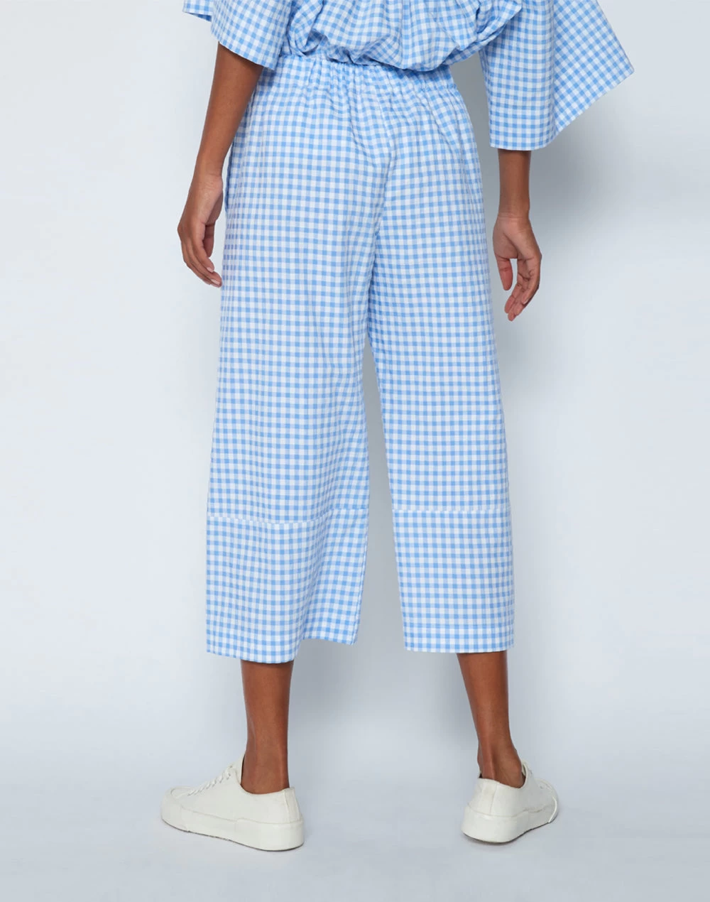 Vestibilità ampia, vita alta, taglio cropped e stampa check per questo pantalone facile da abbinare, da indossare tutta l’estate, perfetto con sneakers e sandali.
