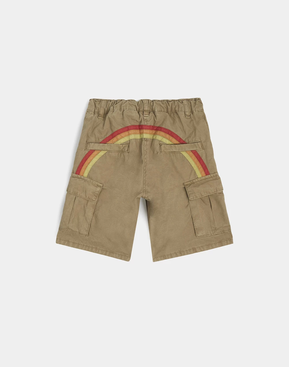Walskshort cargo in tinto capo in cotone popeline. Leggeri, comodi, pratici e stilosi per correre in libertà. Dotati di chiusura con bottone e passante per la cintura. Arcobaleno iconico sul retro.