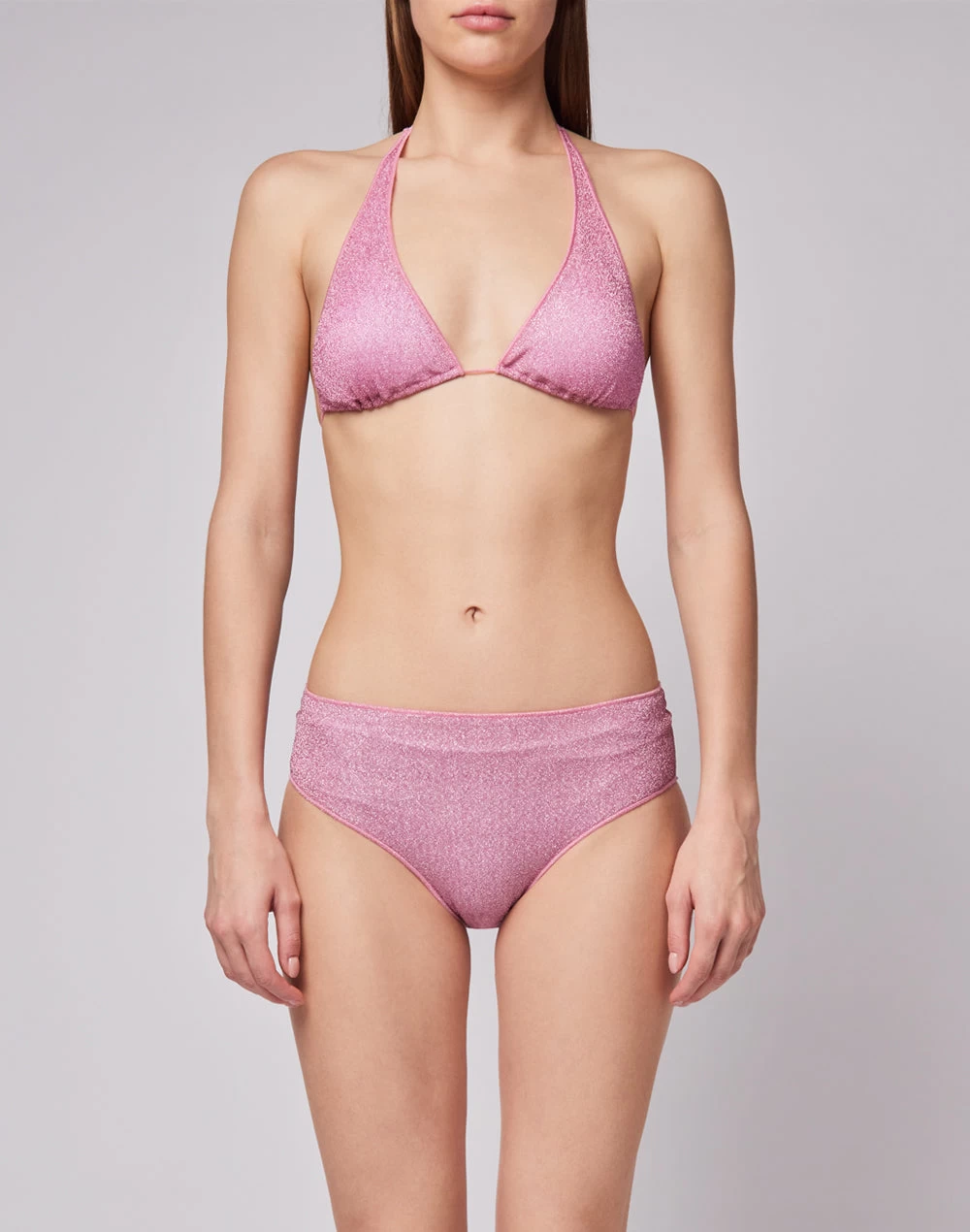 Lurex luminoso e profili a contrasto per questi slip con vita e fianchi alti, da abbinare al reggiseno mare in coordinato preferito.