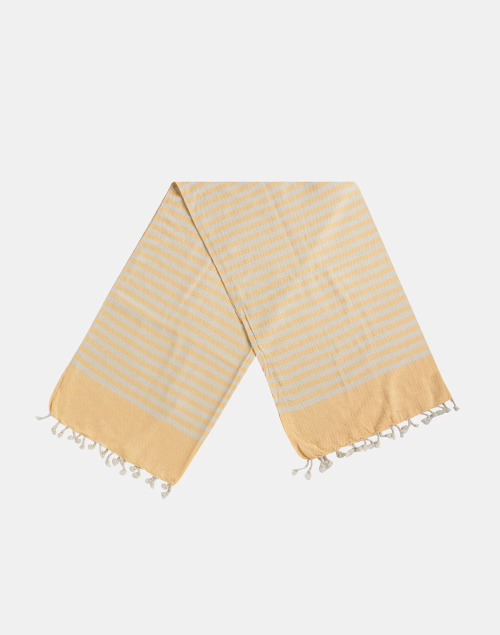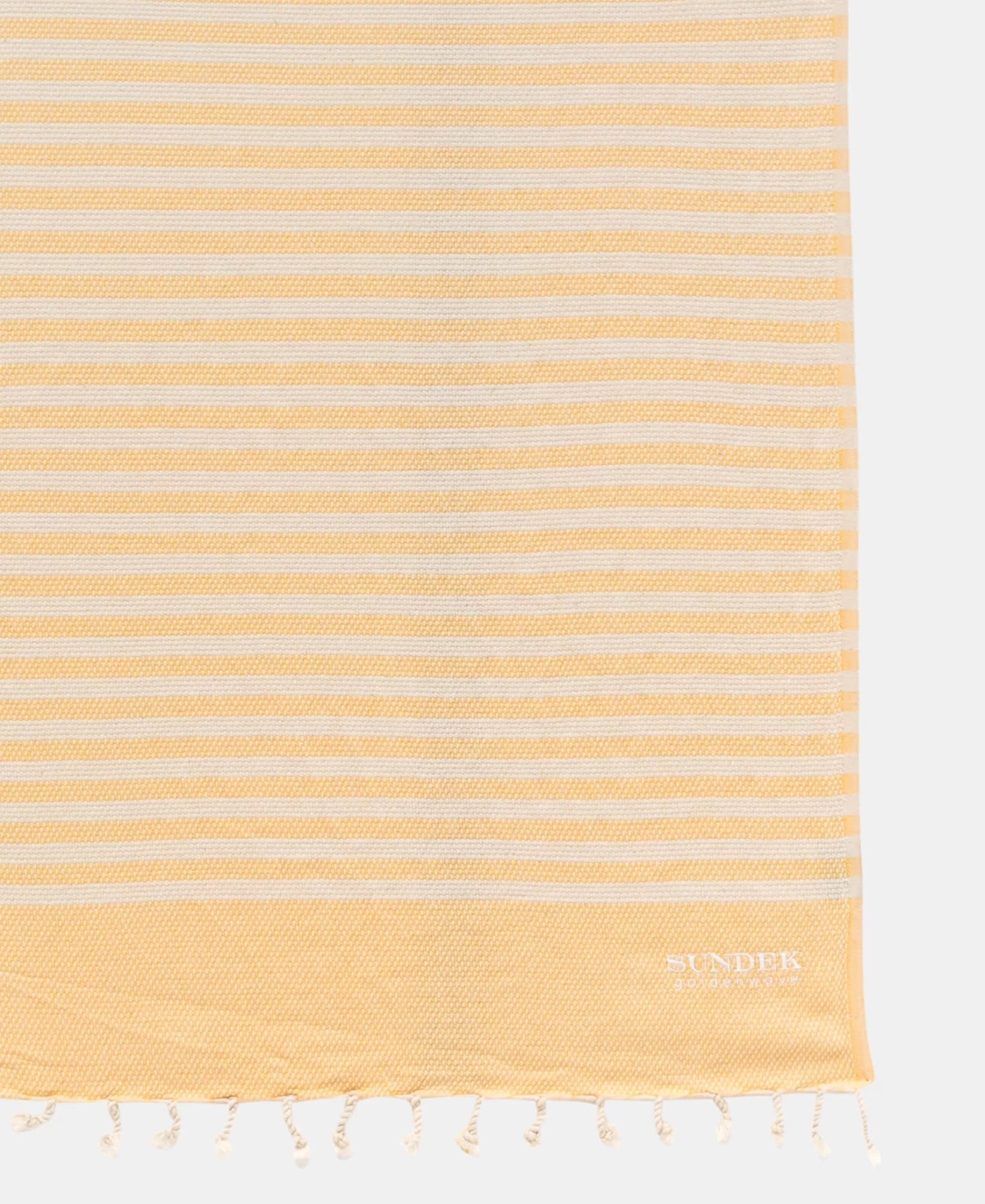 Telo fouta jacquard con righe a trama a nido d’ape, logo Sundek Goldenwave ricamato a contrasto, e fondi con frange intrecciate.