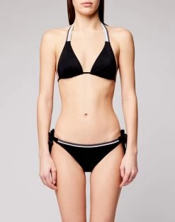 Aggiungi al tuo repertorio beachwear questo completo bikini composto da reggiseno a triangolo ampio imbottito, e dallo slip regular con fianchi regolabili. è personalizzato dalle bande tricolore che arricchiscono i laccetti del triangolo e la fascia in vita dello slip.