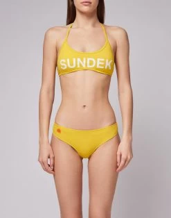 Un bikini colorato dal tocco grintoso e sporty chic, composto da top bralette con scritta SUNDEK a contrasto e culotte arricciate dietro. Vestibilità slim.